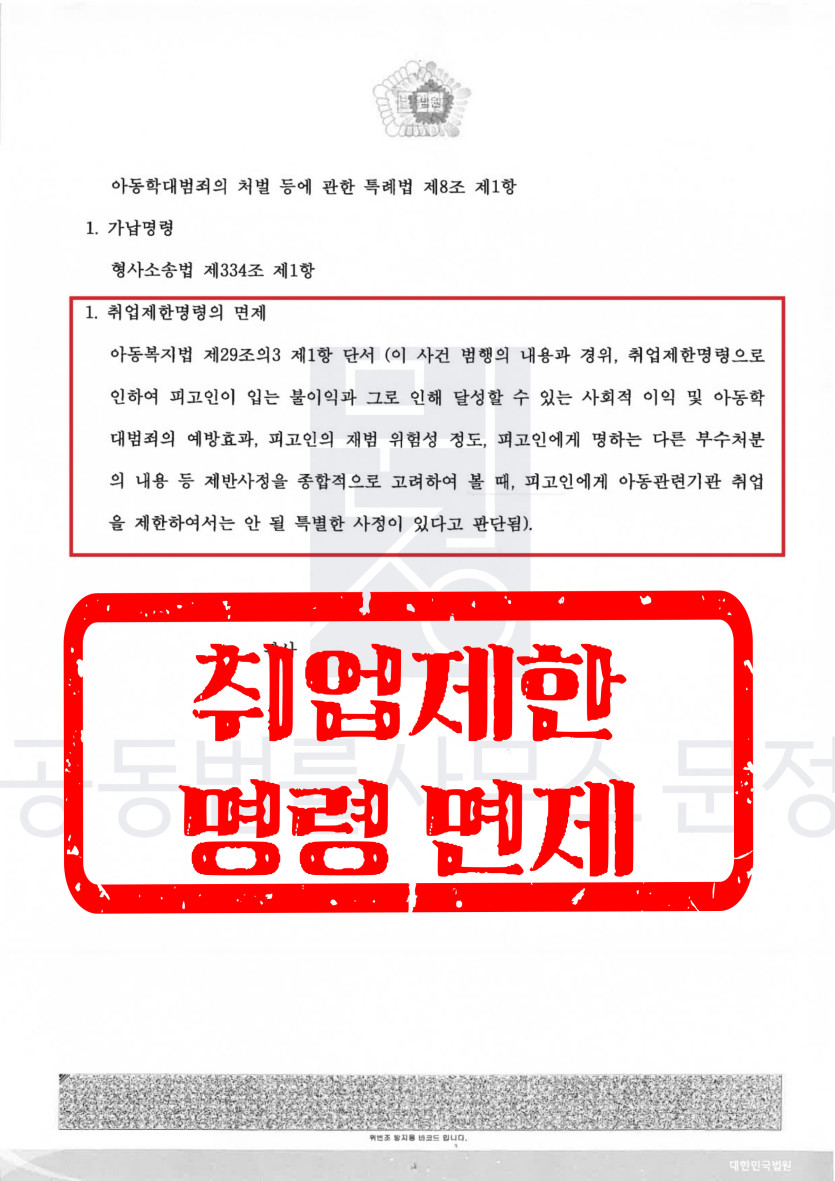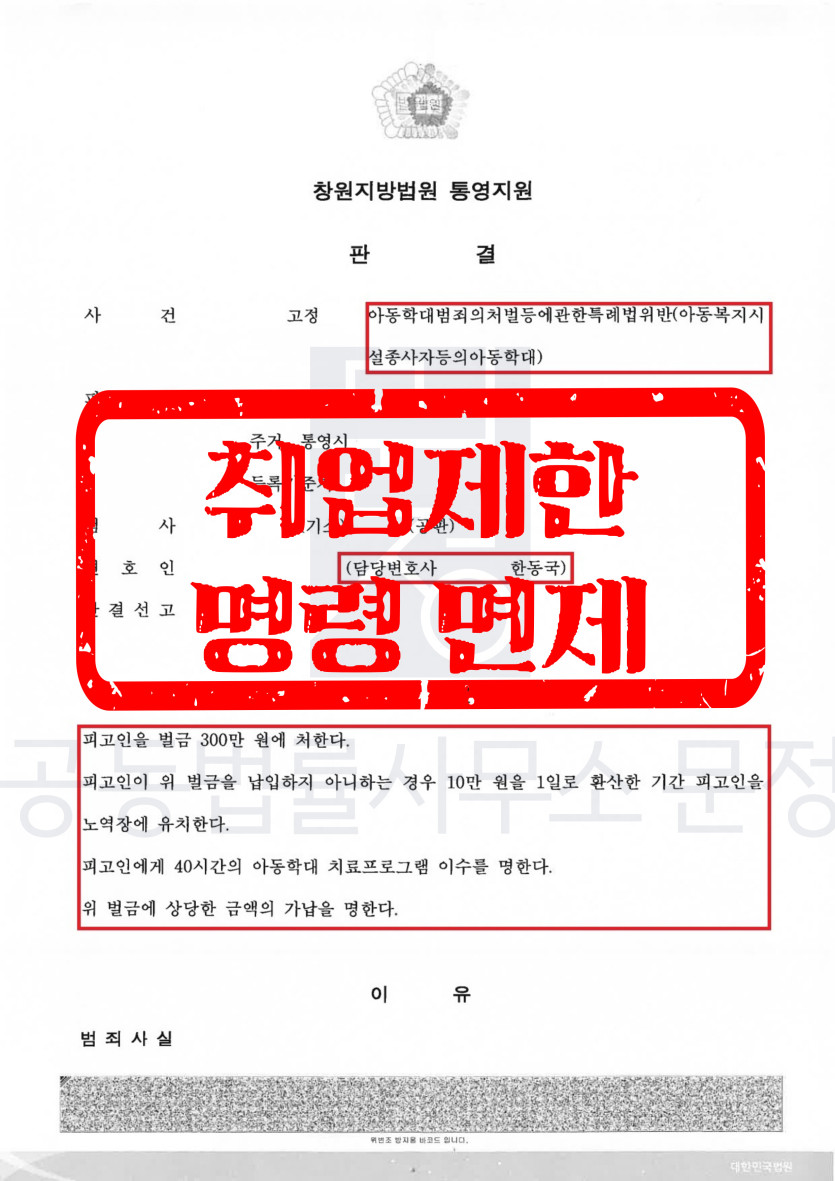 법원은 부산 형사전문변호사 문정이 제출한 상세한 자료 및 이를 토대로 한 적극적인 변론을 받아들여, 의뢰인에 대하여 취업제한명령을 면제하고, 소액의 벌금형을 선고하였습니다.