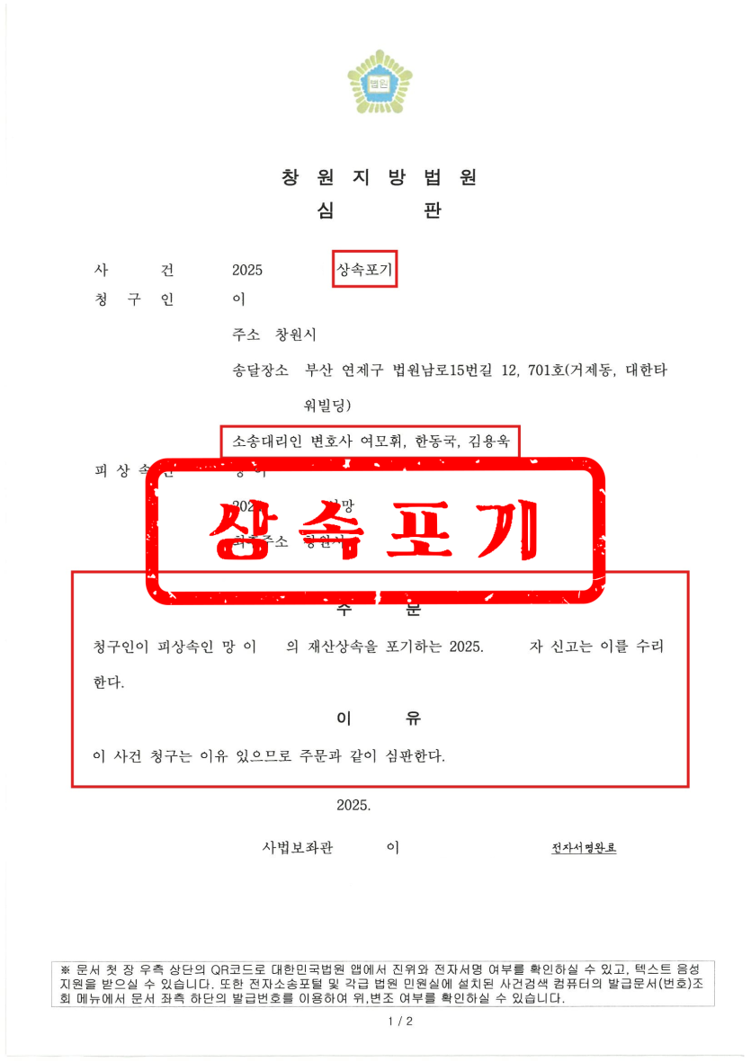 부산상속전문변호사 법무법인 문정은 의뢰인이 부친과 불가피하게 떨어져 살아야 했던 경위, 그리고 사망 사실을 알 수 없었던 객관적인 자료들을 빠짐없이 상세히 제출하였고, 단 한 차례의 보정 없이 상속포기 신청이 그대로 인용되는 결과를 이끌어냈습니다.