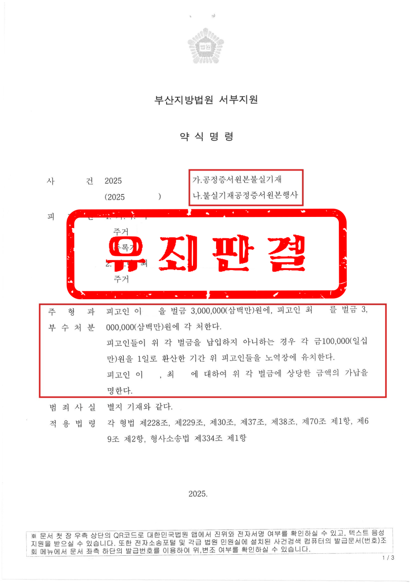 이는 단순한 내부 분쟁이나 명의 다툼이 아니라, 공정증서라는 강력한 집행수단을 악용한 중대 범죄였습니다.