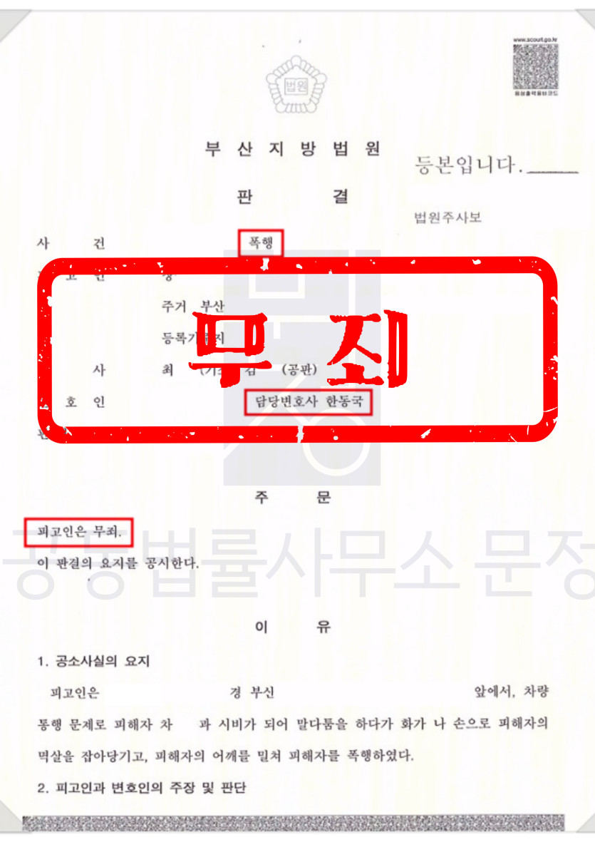 이번에 소개드릴 위닝 케이스는 운전 중 통행 시비로 인해 상대방의 폭행을 저지하다가 쌍방폭행으로 기소된 사안에서, 부산 변호사 문정의 변호인단의 조력으로 무죄를 선고받은 사례입니다.