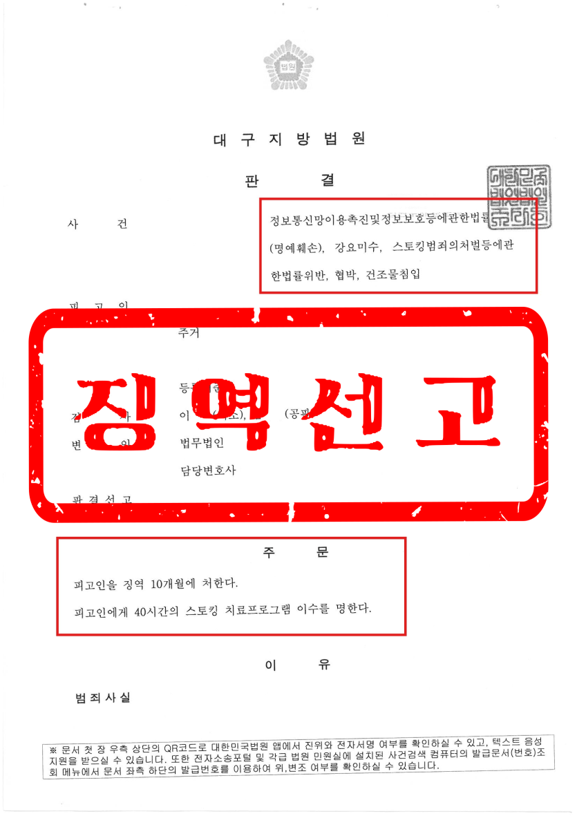 - 단순히 불쾌했다는 진술이 아닌, 객관적인 시점별 스토킹 경위, 인스타 게시글 내용, 침입 당시 정황을 타임라인에 따라 정리하고, - 문자, 인스타 게시글 캡처, CCTV 영상 등 모든 입증 자료 확보를 지원하였습니다.
