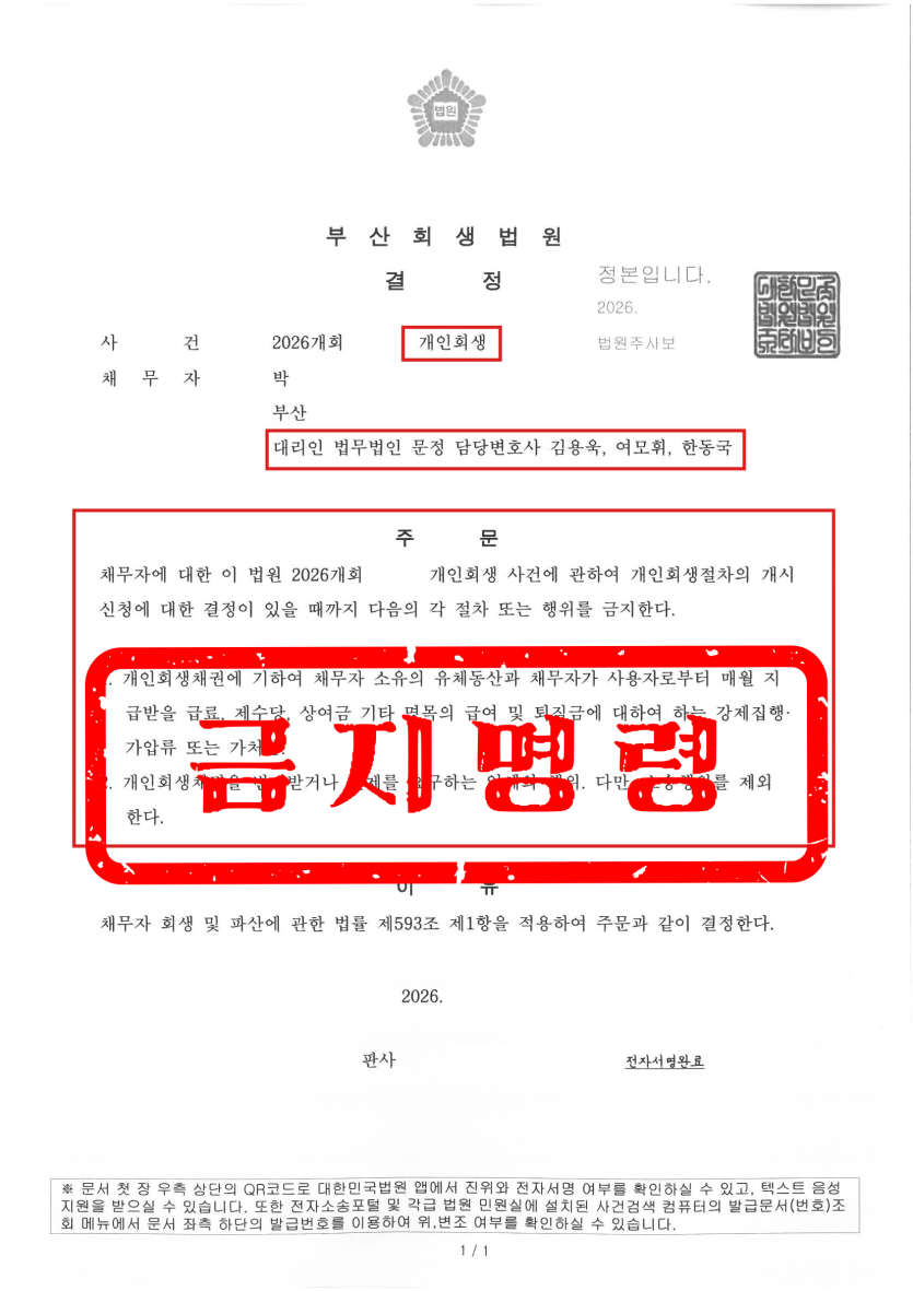 하지만 법원은 꼼꼼하게 작성된 신청서와 소명자료를 바탕으로 개인회생 신청서 접수 후 단 이틀 만에 금지명령을 허가하였습니다.