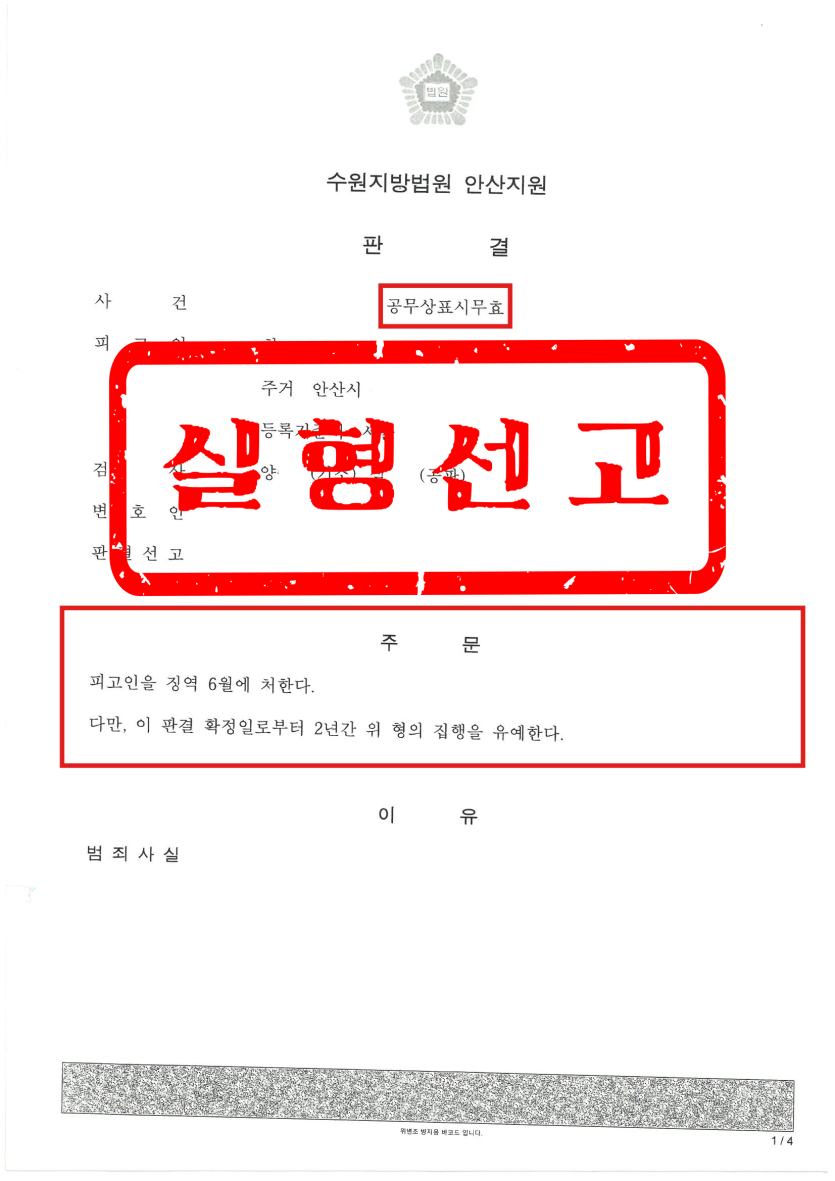 공무상표시무효죄 고소 실형 선고