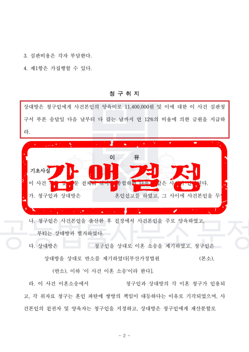 법원에 의뢰인이 전처와 이혼소송을 하는 과정에서 전처가 청구하는 과거 양육비가 의뢰인이 이미 전처에게 지급한 재산분할 액수와 장래 양육비에 포함되어 있다는 점을 적극적으로 주장하였습니다.