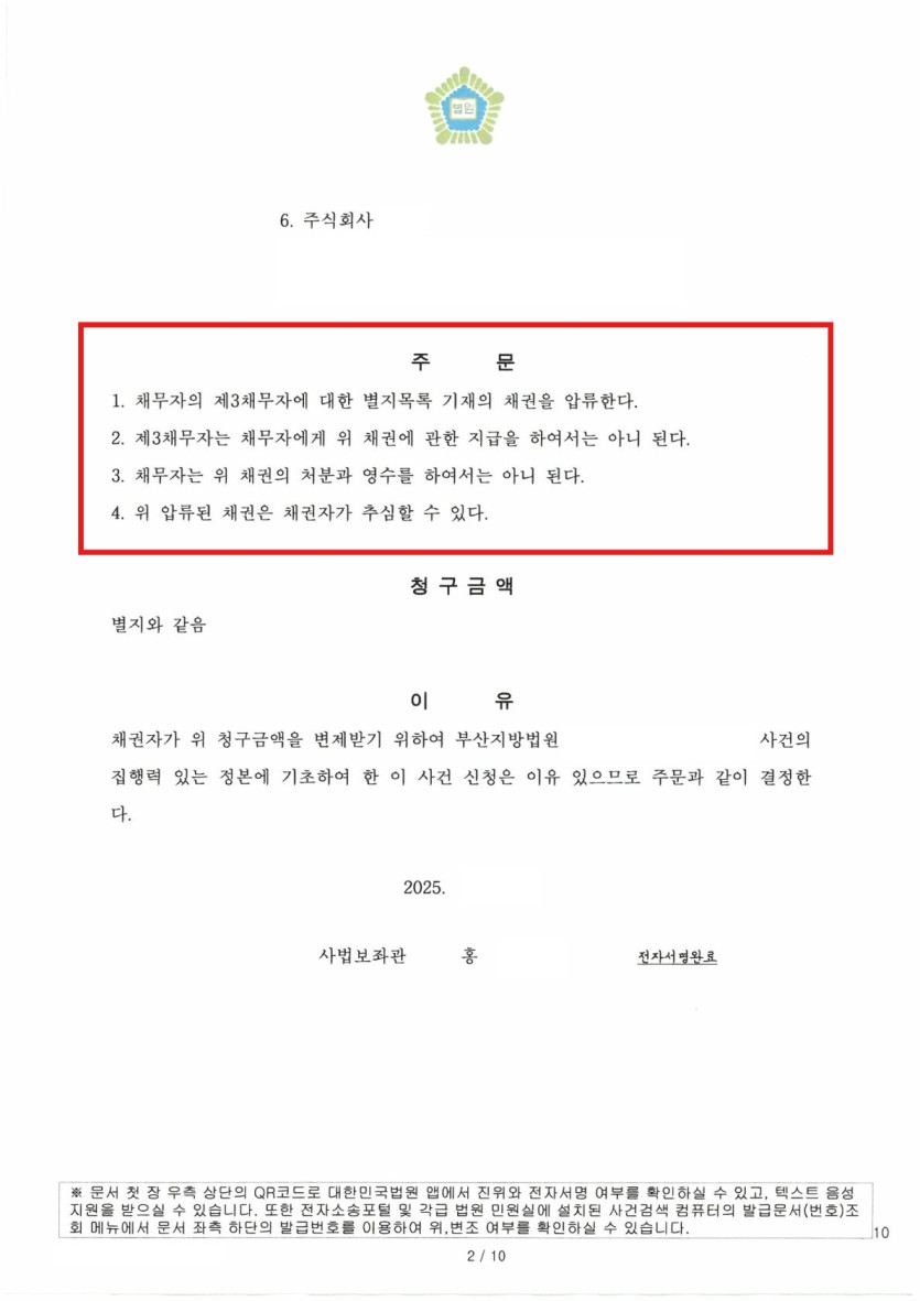 을 포함하여 채권 전액에 대한 압류명령이 결정되었고, 현재 회수 집행이 원활히 진행 중입니다.