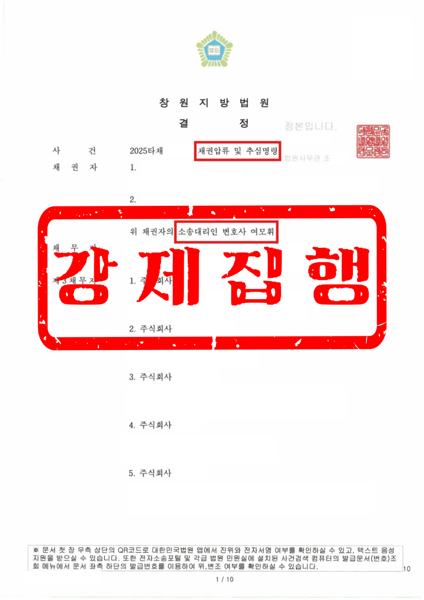 이 집행은 은행 예금 압류와, 채무자가 실질적으로 수익을 창출하는 유통·거래 구조 내 정산 채권을 대상으로 했기 때문에 실효성 있는 집행으로 이어질 수 있었습니다.