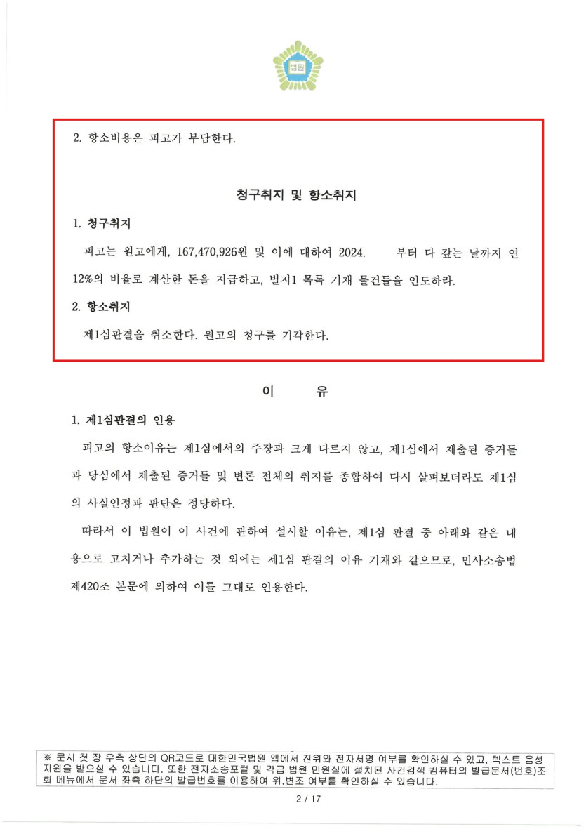 2심 판결 – 항소 기각, 전부승소 유지