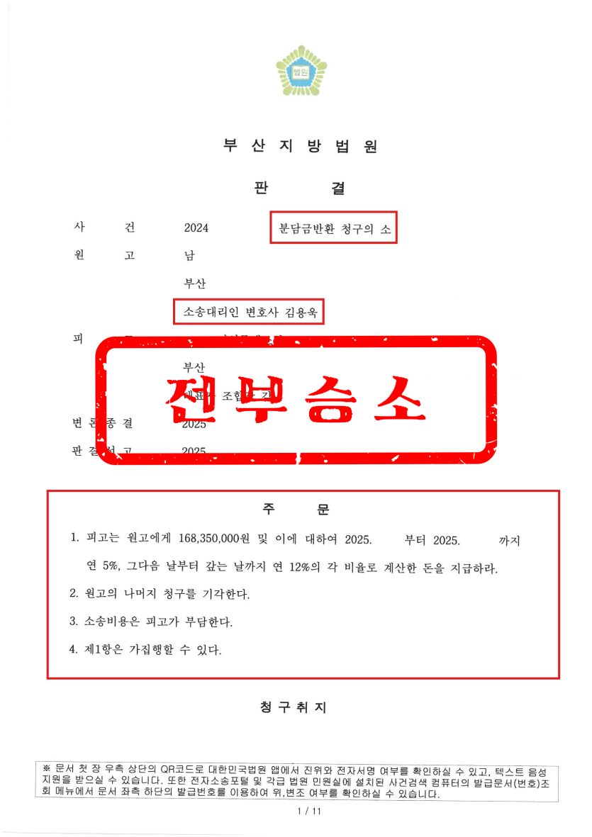 그 결과 법원은 분담금 전액 반환, 지연손해금 지급, 소송비용 전부 조합 부담이라는 판결을 선고하였습니다.